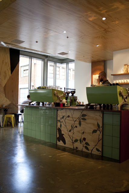 What an altogether fantastic venue for city-bound coffee aficionados. Great coffee, great food, great service and beautiful design. Features include particle-board mosaics on two walls and commissioned art depicting the coffee plant in cherrie
